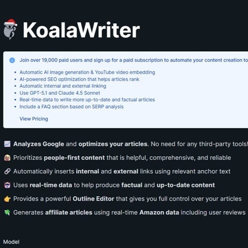 Tarifs : ils reposent sur un système d’abonnement avec crédits. Une formule basique est proposée à partir de 9 dollars par mois, suffisante pour tester l’outil ou produire quelques articles. Les formules Premium vont de env. 50 à 2000 dollars par mois selon le volume de mots inclus. Koala Writer propose un essai gratuit comprenant 5000 mots et 25 messages de chat, sans carte de crédit.